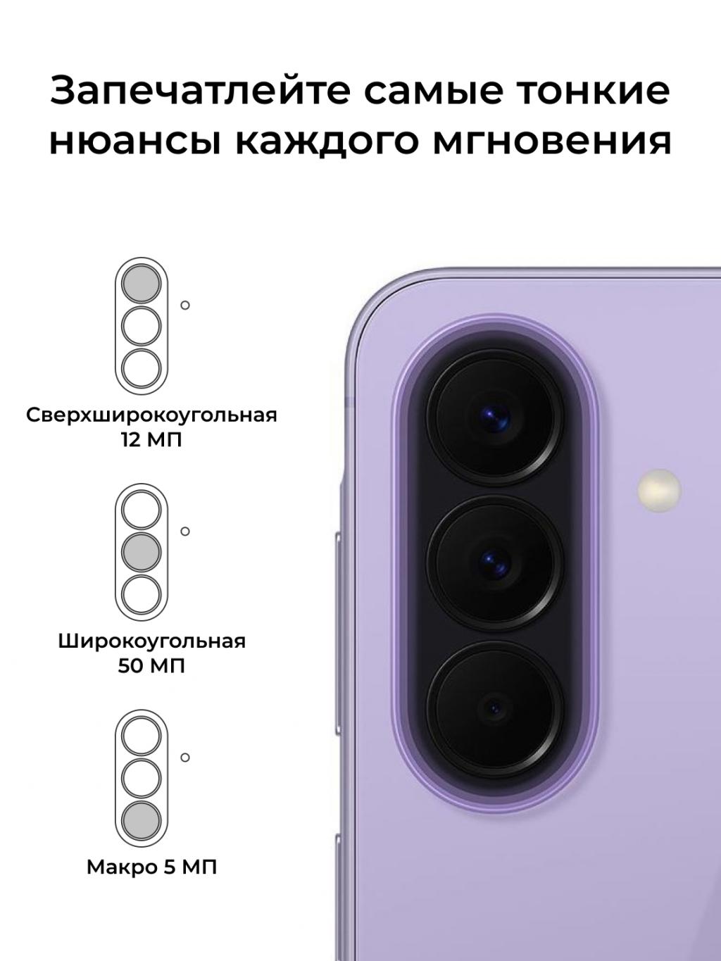 Основной сенсор на 50 МП с OIS делает чёткие снимки при разном освещении и минимизирует смаз при съёмке в движении. Сверхширокоугольный модуль на 12 МП подходит для пейзажей, архитектуры и групповых фото. Макрокамера на 5 МП позволяет сфокусироваться на мелких деталях с близкого расстояния. Видео записывается в разрешении UHD 4K при 30 кадрах в секунду.