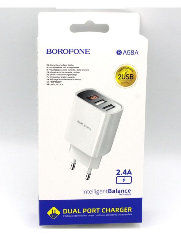 Borofone Блок питания сетевой 2-USB ,BA58A, огнестойкий + дисплей, 2,4ма, белый