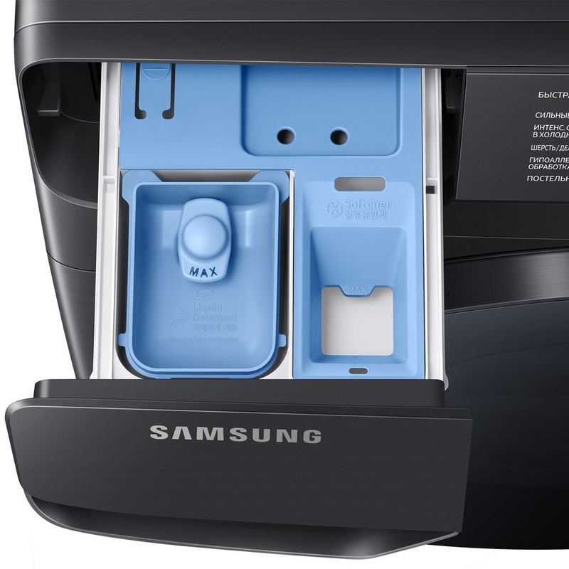 Модель поддерживает Wi-Fi. Мобильное приложение SmartThings запоминает привычки владельца, предлагает циклы, которые считает оптимальными для него, и дает советы по устранению неполадок. Предусмотрена защита от детей.