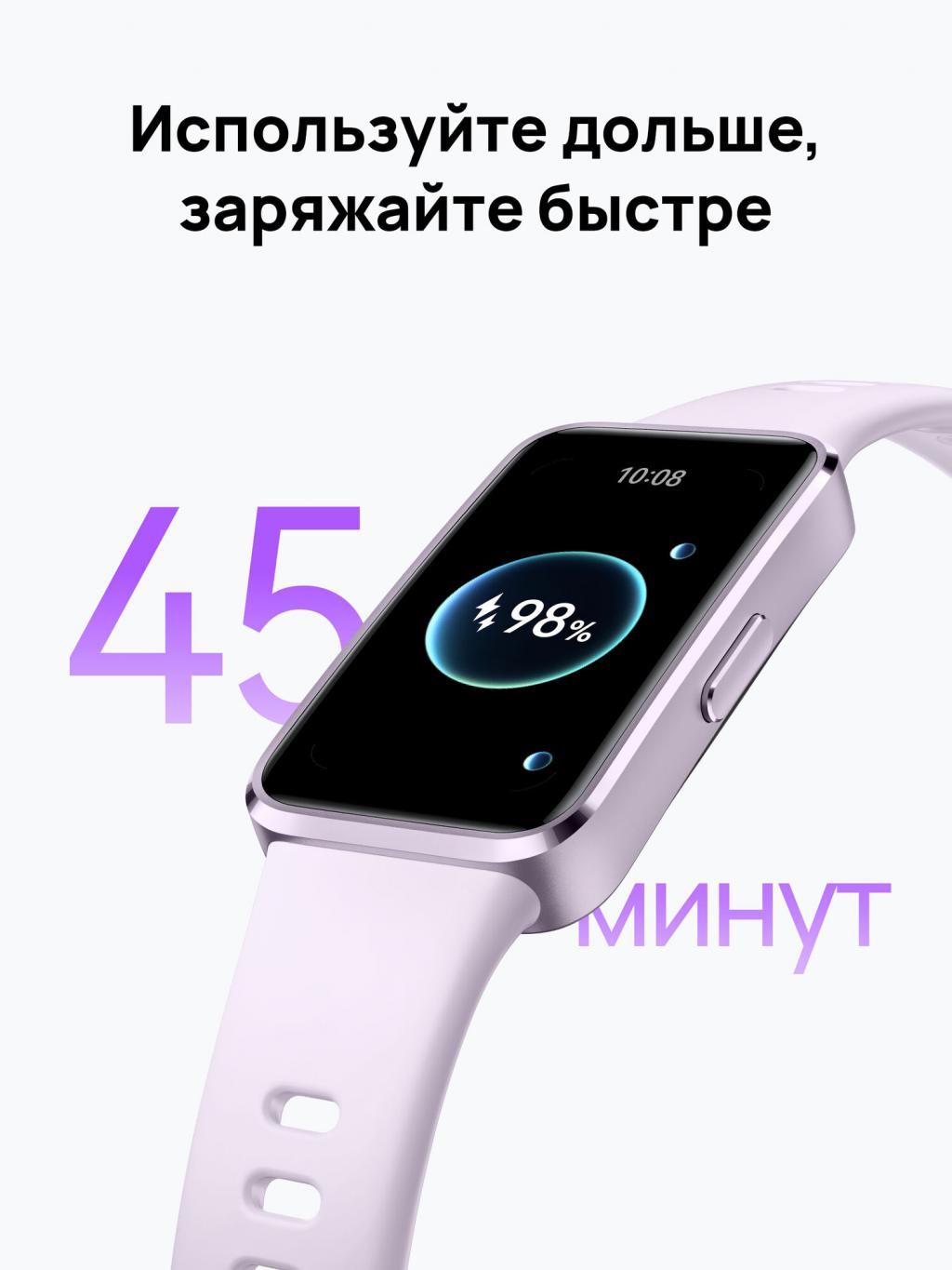 Для удобства зарядки браслет оснащен магнитным портом, который обеспечивает надежное соединение с зарядным устройством. Это позволяет быстро заряжать браслет — восстановление энергии занимает всего 45 минут.