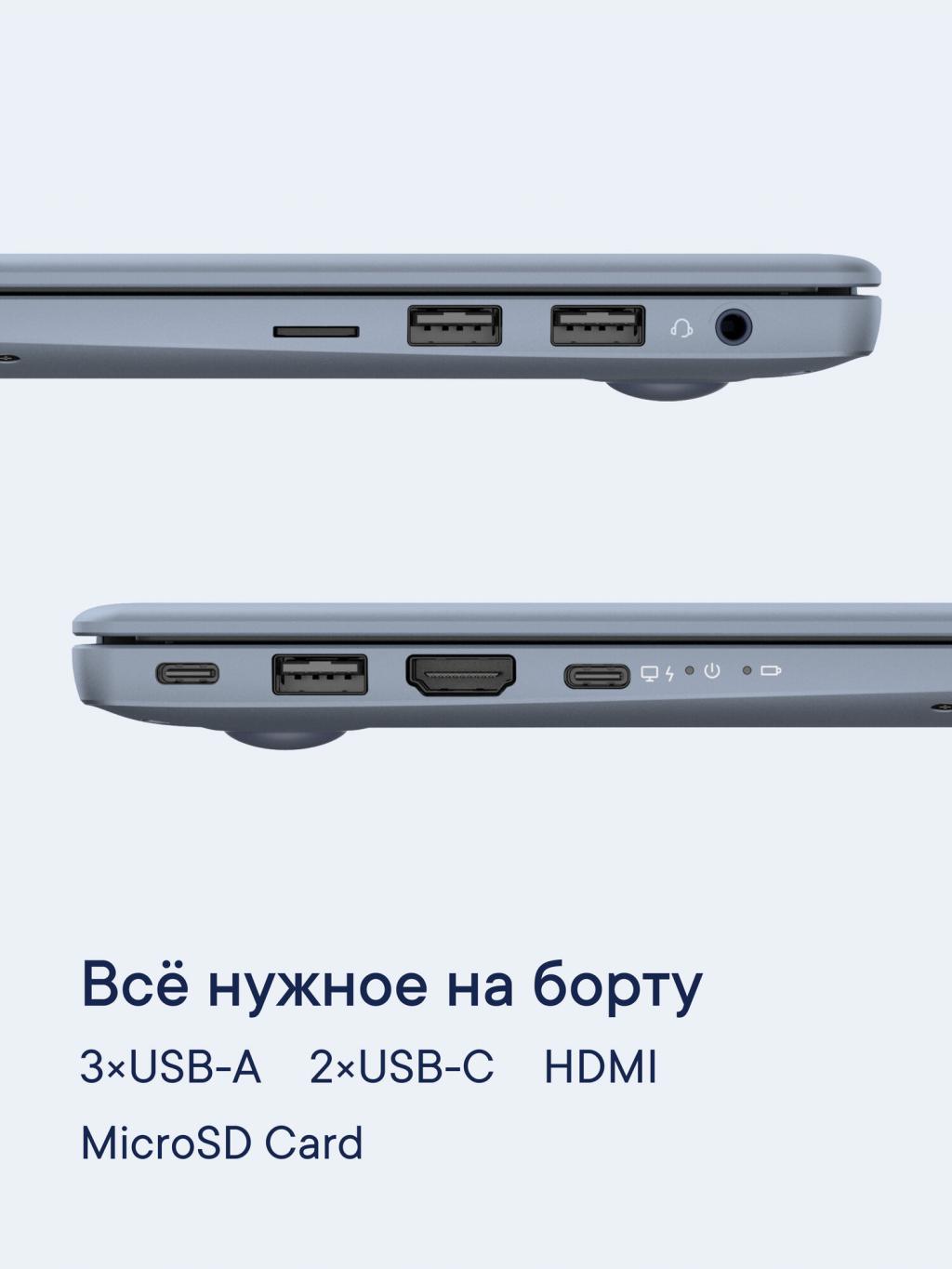 Подключайте всё, что потребуется для работы: есть три USB-порта, а также Type-C для зарядки и передачи данных, HDMI для внешнего экрана и слот для microSD-карт.